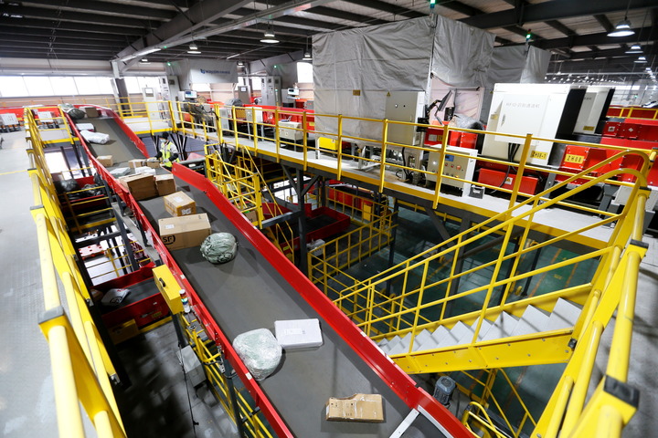 “双11”期间,青岛某物流分拨中心,全自动智能分拣系统正在分拣包裹。新华社发(梁孝鹏 摄)