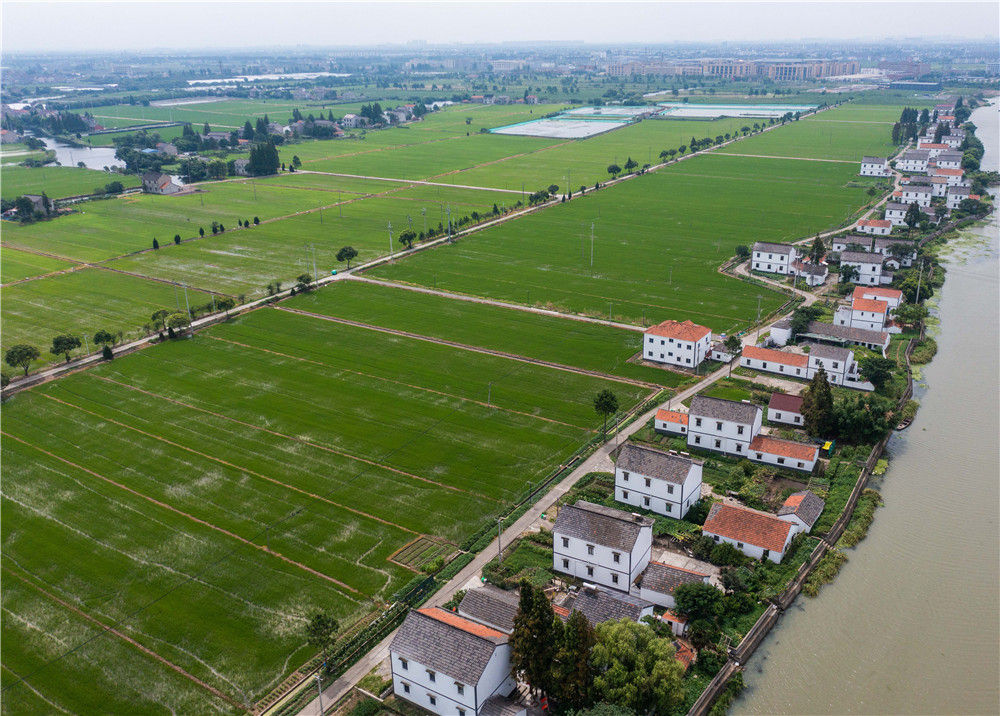 空中俯瞰浙江省嘉兴市嘉善县西塘镇红菱村的连片稻田和美丽村居(7月13日摄,无人机照片)。新华社记者 徐昱 摄