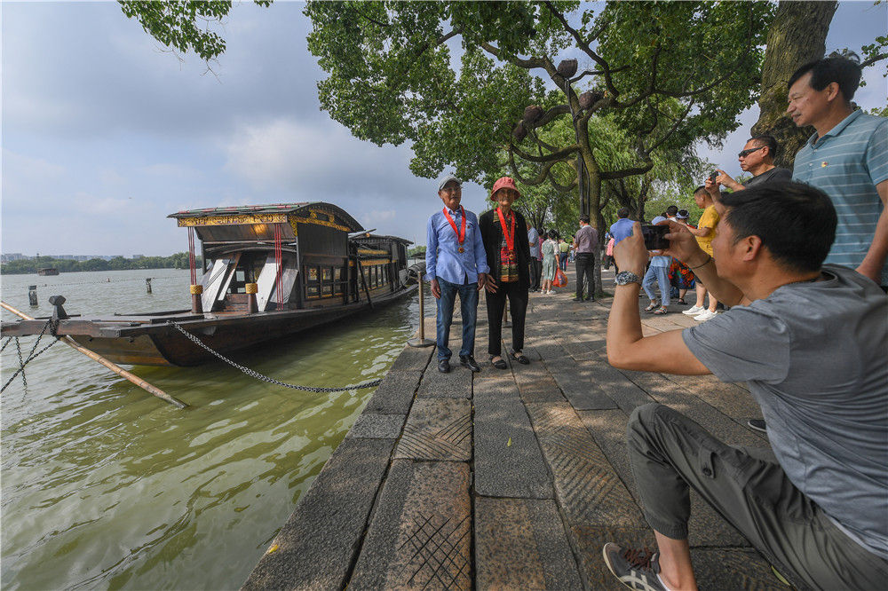 两名老党员在浙江嘉兴南湖湖心岛停泊的南湖红船旁拍照(7月1日摄)。新华社记者 徐昱 摄