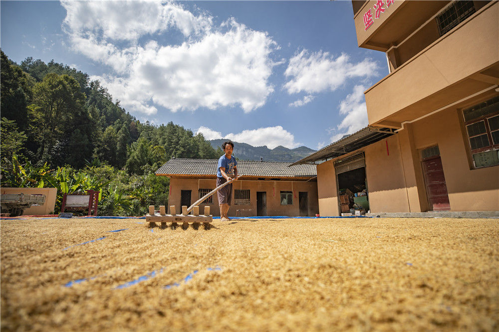10月3日,重庆市酉阳土家族苗族自治县花田乡何家岩村村民在晾晒水稻。新华社记者 黄伟 摄