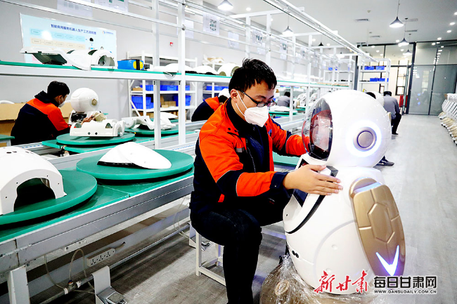 张掖经济开发区智能制造产业园的创泽智能机器人(甘肃)有限公司智能机器人生产线上,技术人员正在组装智能机器人。(3月12日摄)新甘肃·每日甘肃网通讯员成林