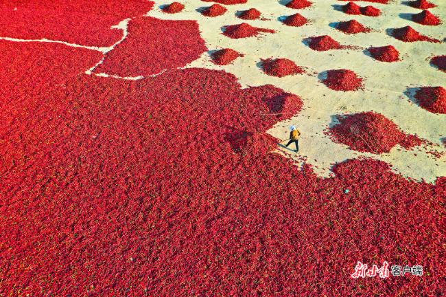 高台县合黎镇八坝村戈壁滩上,成片晾晒的辣椒映红大地。(9月12日摄)新甘肃·甘肃日报通讯员郑耀德