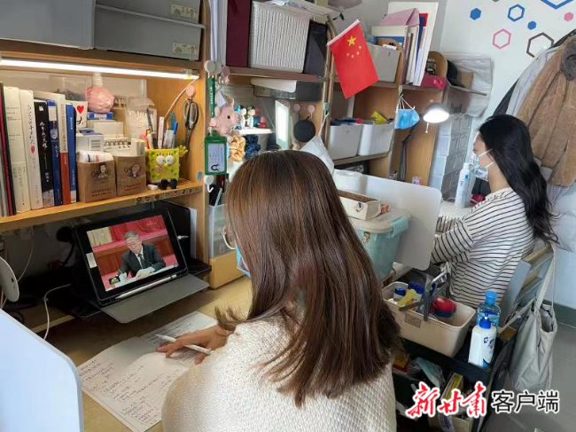 兰州大学学生在宿舍收看党的十九届六中全会新闻。兰州大学供图