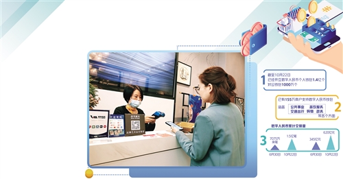 《中国数字人民币的研发进展白皮书》公布的数据显示,截至今年6月30日,共开通个人钱包2087万余个。而最新数据显示,截至10月22日,已经开立数字人民币个人钱包1.4亿个。