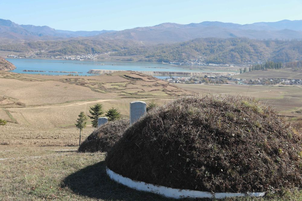 这是10月23日在朝鲜咸镜南道西北部拍摄的长津邑中国人民志愿军烈士合葬墓地。山坡下的湖即为朝鲜北部最大的湖泊长津湖。新华社记者 江亚平 摄