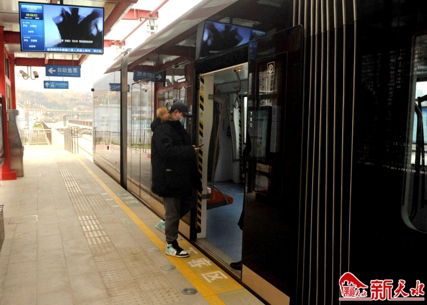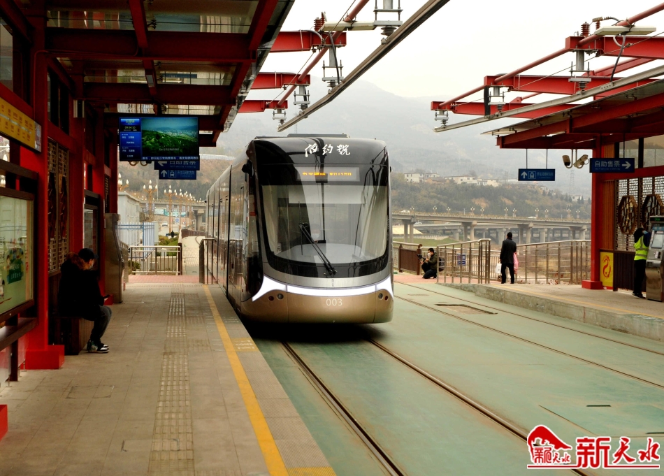 11月19日早上8时,秦州区五里铺有轨电车车站,一名乘客踏上从秦州开往麦积方向的有轨电车。