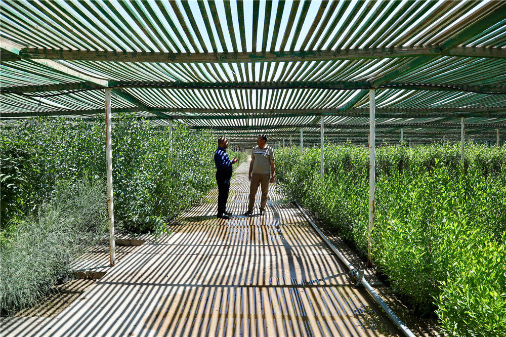 2018年8月11日,伊拉克国家荒漠化防治委员会农业副总工程师萨马德·卡米勒·阿里(右)站在巴格达东南部防治荒漠化育林中心内。新华社发(哈利勒·达伍德 摄)