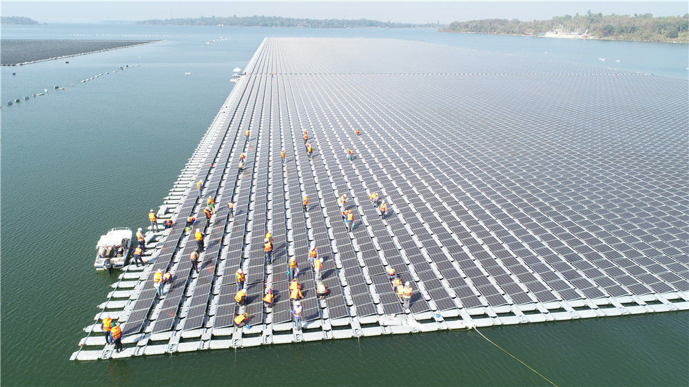 泰国,乌汶府诗琳通水库,也漂浮着这样的深蓝“岛屿”。那是中泰两国联合承建的诗琳通大坝综合浮体光伏项目,实现了浮体光伏与水电设备交替或同时发电,使得可再生能源成功避开天气的不确定性从而长时间连续发电,每年减少约4.7万吨温室气体排放。