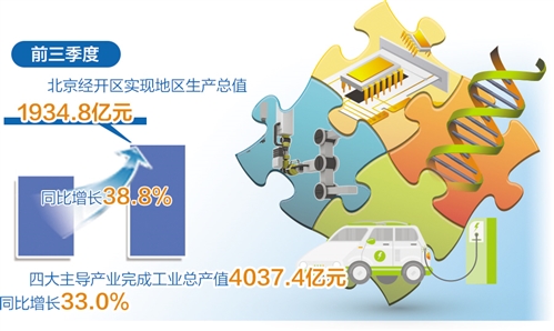 不仅如此,北京经开区主导产业接连表现出上扬的曲线。数据显示,1月至9月,亦庄新城完成工业总产值4559.9亿元,同比增长30.1%。其中,经开区完成工业总产值4243.6亿元,同比增长32%,两年平均增长17.7%。四大主导产业完成工业总产值4037.4亿元,同比增长33.0%,占经开区工业总量的95.1%。