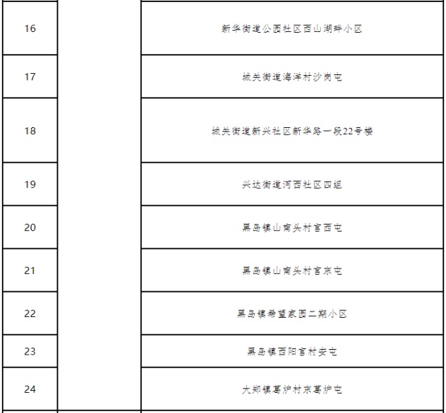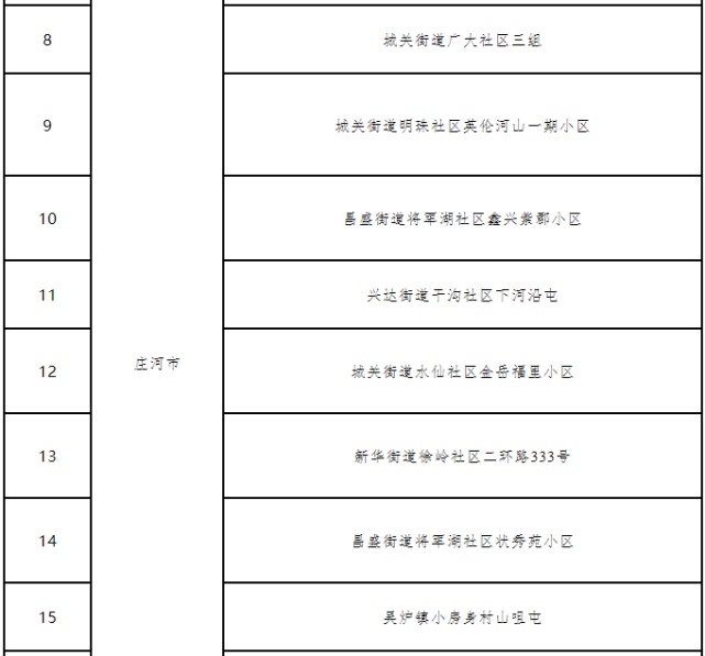 央广网沈阳11月23日消息(记者 吕文卫)记者从大连市新冠肺炎疫情防控总指挥部获悉,大连市严格落实新冠肺炎疫情防控各项措施,至2021年11月22日24时,大连市庄河市城关街道海洋村刘亮屯等30个中风险地区(详见附表)已连续14天无新增本土新冠肺炎确诊病例,根据国务院联防联控机制《关于调整新冠肺炎疫情分区分级标准实施精准管控措施的通知》(国电发﹝2020﹞11号)要求,经请示省总指挥部同意,从2021年11月23日0时起,将大连市庄河市城关街道海洋村刘亮屯等30个中风险地区调整为低风险地区。提醒广大市民朋友请继续加强个人防护,遵守执行各项防控要求,共同助力全市疫情防控工作大局。
