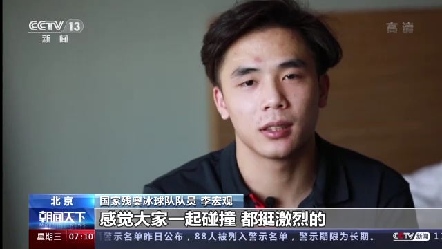 国家残奥冰球队队员 李宏观:第一次参加冰球训练的时候,就感觉非常有意思,因为当时在观看席上看他们的训练,大家一起碰撞,都挺激烈的,感觉在赛场上飞驰。因为没有左腿,就感觉在冰上滑行也类似于一种跑,挺向往的。