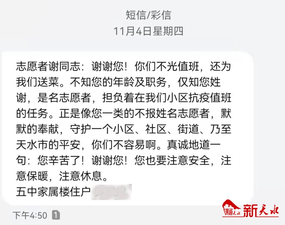 “我不知道您的年龄和职务,只知道是一名志愿者,担负着我们小区的抗疫值守任务,正是有了像您这样默默奉献的人,守护着小区、社区、街道乃至天水市,我们大家才能平安,我真诚地道一句您辛苦了,谢谢!”这是志愿者谢天明收到的一条短信。