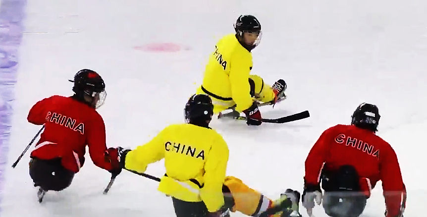 全速滑行、急停转弯、分组进攻,在位于北京顺义的国家残疾人冰上运动比赛训练馆里,中国残奥冰球集训队正在热火朝天地训练。训练课结束后,队员们划乘着特制的冰橇离开场地,卸下装备时已经汗流浃背。