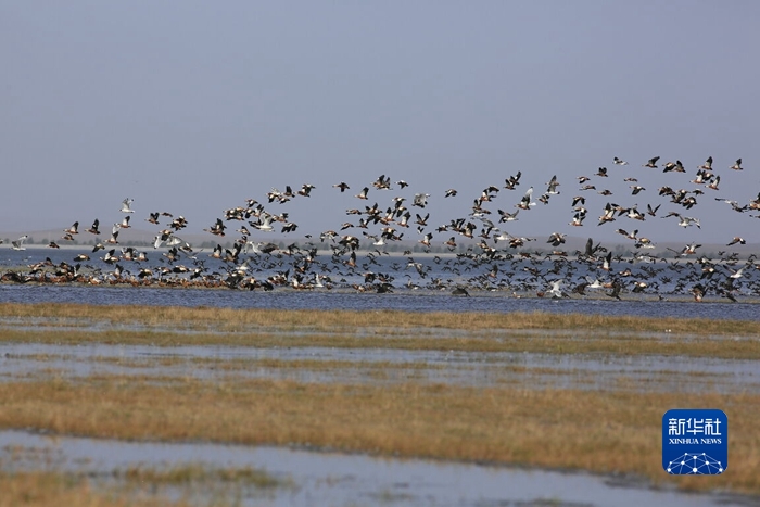 甘肃民勤:近万只“美丽过客”停留在沙漠湿地公园