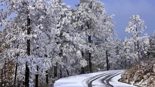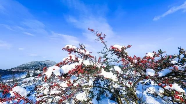 被冰雪覆盖的千野草场与白雪、火棘构成唯美画面,玉树琼花,目不暇接。