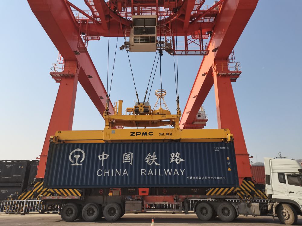 工人们正在甘肃(兰州)国际陆港集装箱场站开展货物装载作业。(受访单位供图)