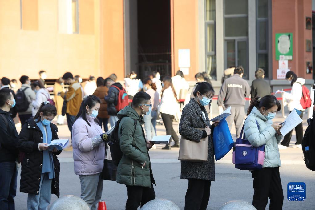 11月28日,在江苏无锡旅游商贸高等职业技术学校考点,考生在等候进场时复习。新华社发(还月亮摄)