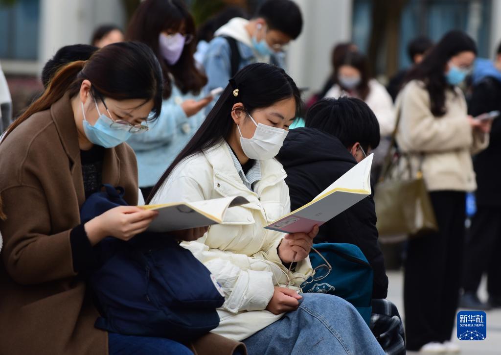 11月28日,在位于合肥市的安徽考区45中橡树湾校区考点,考生在等候进场时复习。新华社发(陈三虎摄)