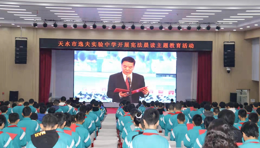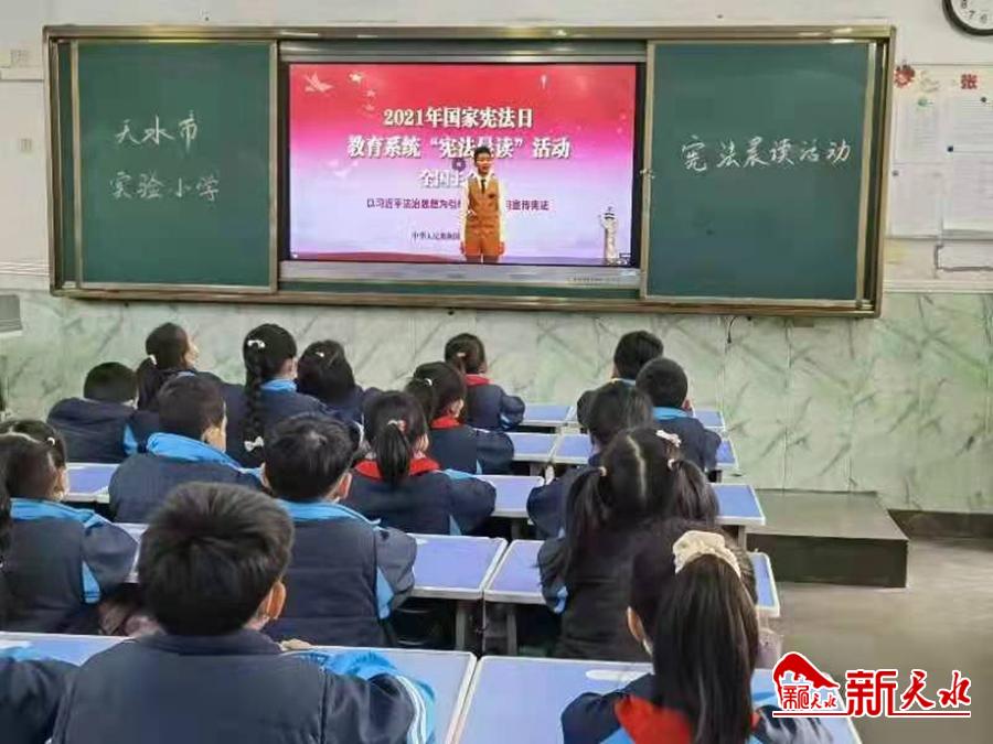 12月3日,天水市教育局组织全市中小学登录全国青少年普法网与教育部主会场同步开展“宪法晨读”活动,开展了升旗仪式、宪法条文朗读、合唱《宪法伴我们成长歌曲》等内容。活动结束后,各学校举办了宪法知识讲座、诵读、演讲、主题板报展等活动,全方位深入宣讲宪法知识、弘扬宪法精神。