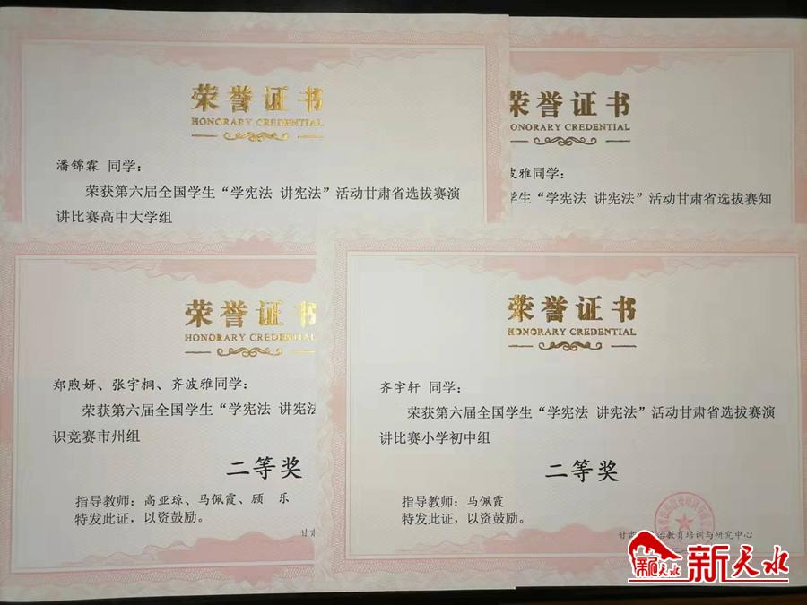 在刚刚结束的第六届全国学生“学宪法 讲宪法”活动甘肃省选拔赛中,市逸夫实验中学齐宇轩同学获得演讲比赛二等奖、市实验小学张格悦同学获得演讲比赛三等奖、天水市教育局获得知识竞赛团体二等奖的好成绩。 (天水市教育局供稿)