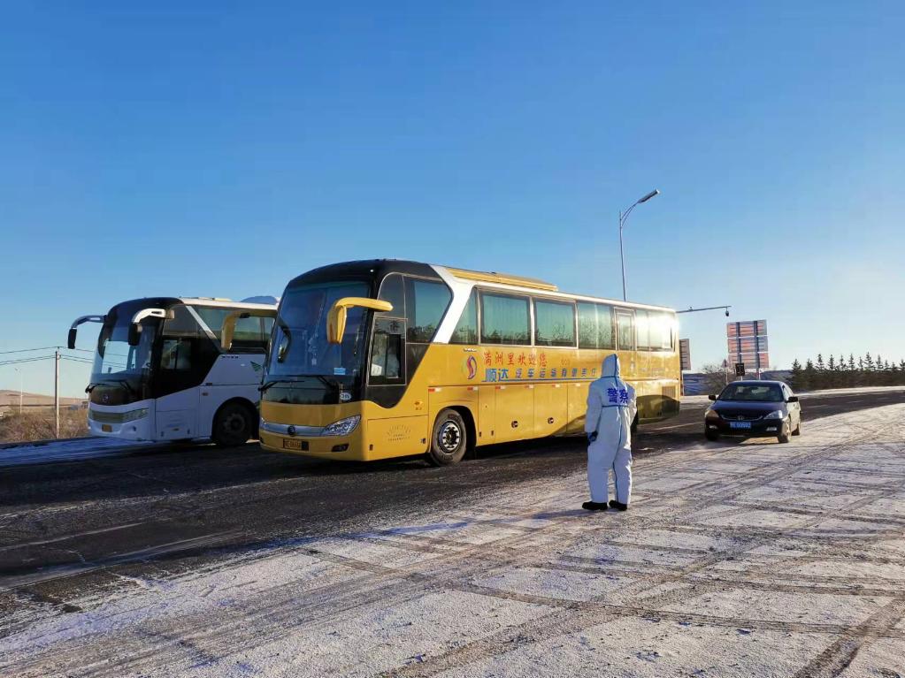 鹰山平交路口是满洲里市的出城口,几辆贴着“疫情防控执守车”的大巴车已在这里集合,车上坐着身穿防护服、即将转运至异地隔离的密接人员。