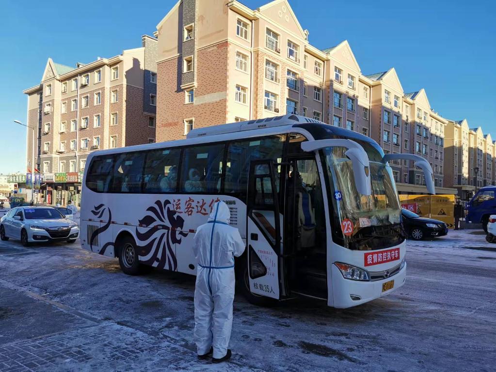 满洲里市的密接人员统一乘坐转运大巴前往异地隔离。(采访对象供图)