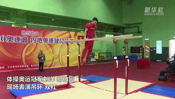 体操奥运冠军刘洋、邹敬园现场表演吊环、双杠。