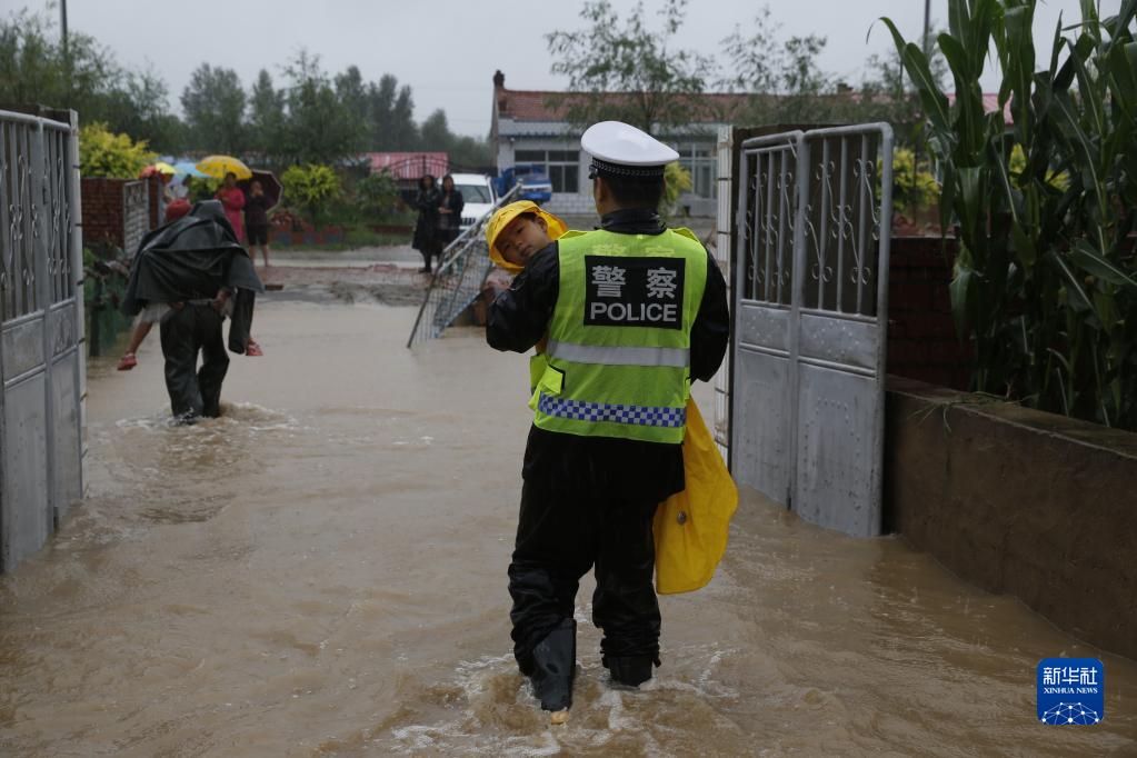 2017年8月3日,奈曼旗公安局民警冒雨将一名儿童从被积水淹泡的房院中抱出。(陆继成摄)