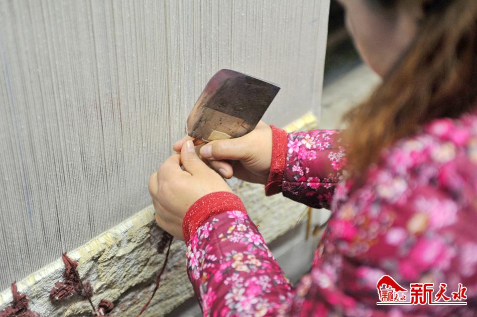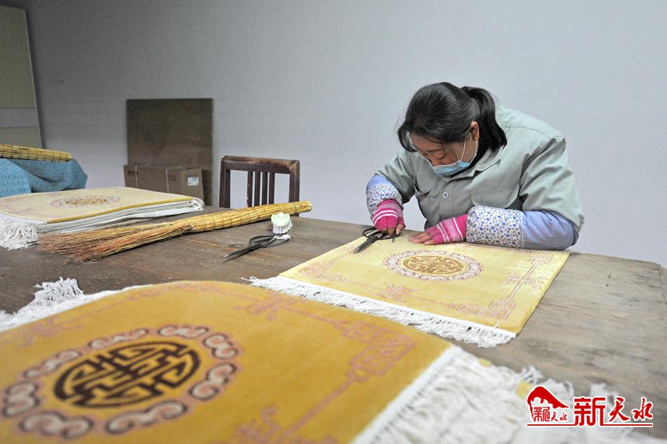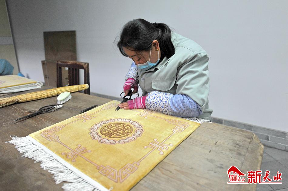 织造车间里,编织架前的女工们手拿小刀、挑线织毯、操作娴熟。她们精巧的指尖动作,绘就了一张张华美的天水丝毯。天水丝毯的编织采用打结栽绒方法,是我国传统手工编织技艺的典型代表。