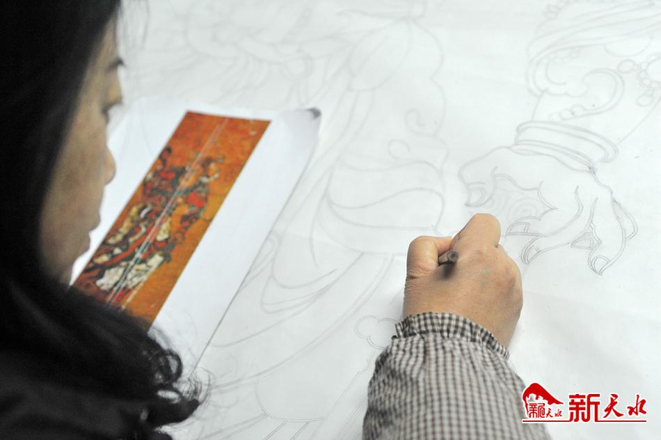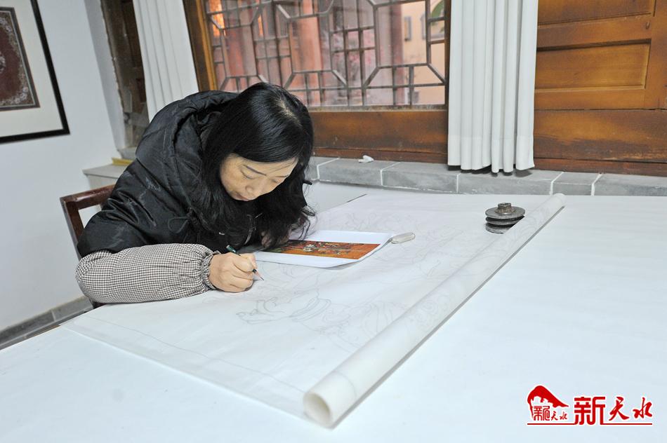 另一个房间,工艺美术师黄晶蓉在伏案绘制艺术丝毯图案。天水丝毯图案以地方名胜古迹、自然风光和传统纹样为题材,又从我国古代青铜器文化、雕刻、壁画、绘画、书法中吸取营养,经过数代传承人的努力,形成了有地域文化特色的传统工艺美术品。