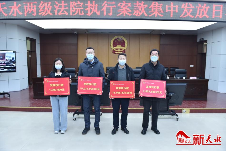 在市中院活动执行案款集中发放现场,邀请了市委政法委、市检察院相关负责人,部分市人大代表、市政协委员、律师代表、特邀监督员、媒体记者全程见证监督。市中院相关负责人通报了天水两级法院当前执行工作质效指标、执行案款发放情况及对下一步执行领域重点工作进行了安排部署。