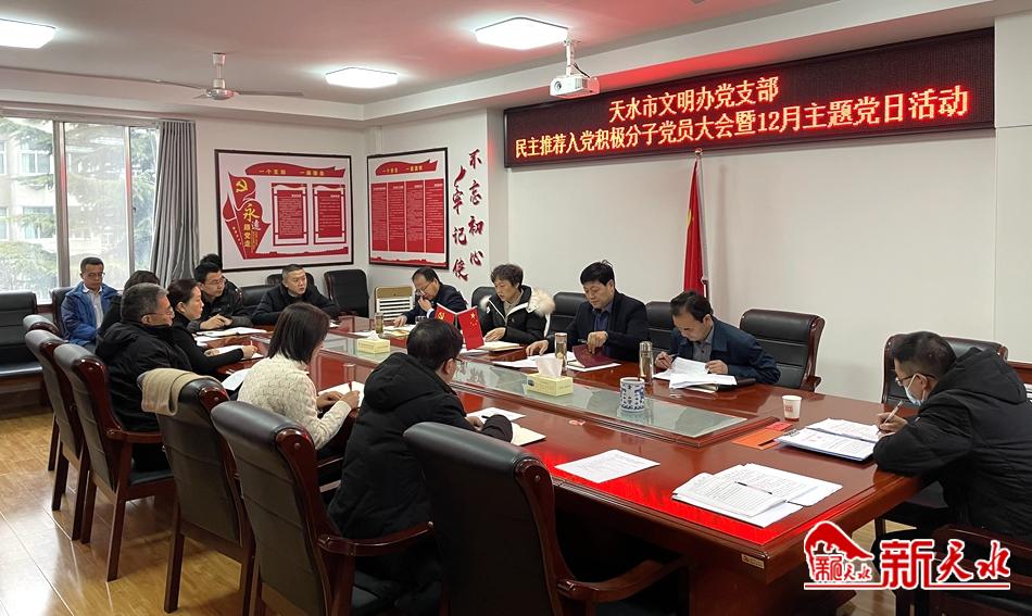 新天水讯 12月13日上午,天水市文明办党支部以“深入学习贯彻天水市第八次党代会精神,立足本职岗位奋进新征程、建功新时代”为主题,组织开展民主推荐入党积极分子党员大会暨12月主题党日活动,领导班子成员和全体党员共15人参加。
