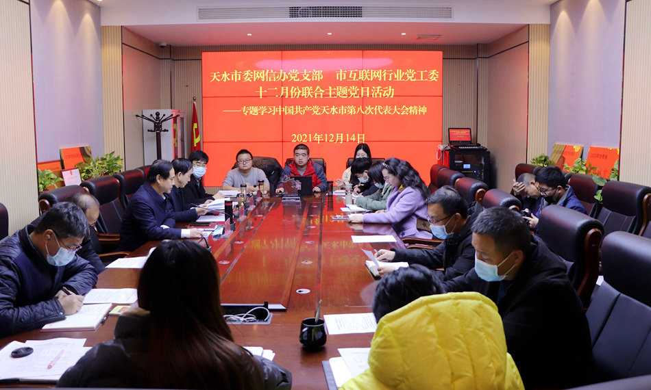 12月14日上午,天水市委网信办党支部、市互联网行业党工委联合召开十二月份主题党日活动,专题传达学习中国共产党天水市第八次代表大会精神。市委宣传部副部长、市委网信办主任、市互联网行业党工委书记刘越高同志主持学习,并就全市网信系统深入学习宣传贯彻市第八次党代会精神做了安排部署。