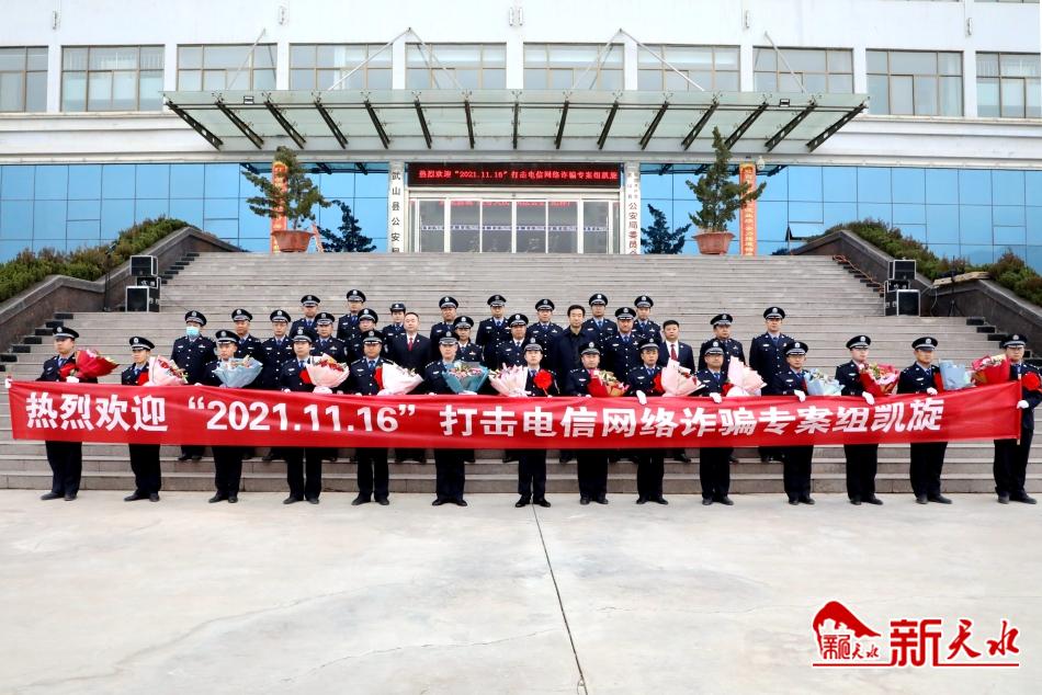 新天水讯【记者蔚军平】12月14日下午,武山县公安局举行“2021·11·16”电信网络诈骗专案组凯旋欢迎仪式,对专案组成功侦破案件凯旋表示慰问,对参战民警的辛勤付出致以崇高敬意。该案的成功破获,是武山县公安局在连续破获多起命案积案之后在打击电信诈骗战役中收获的又一重大战果。