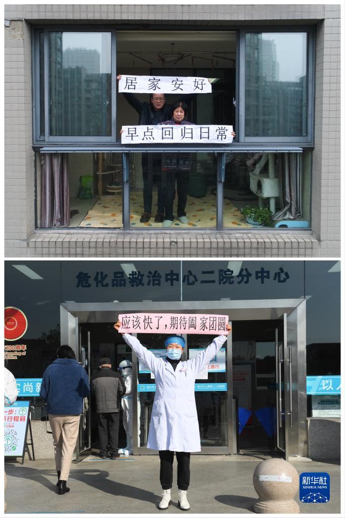 这张拼版照片的上图:12月16日,在百官街道阳光假日小区,公务员严先生和岳母戚女士向在一线抗疫的家人表达问候和祝愿(无人机照片)。