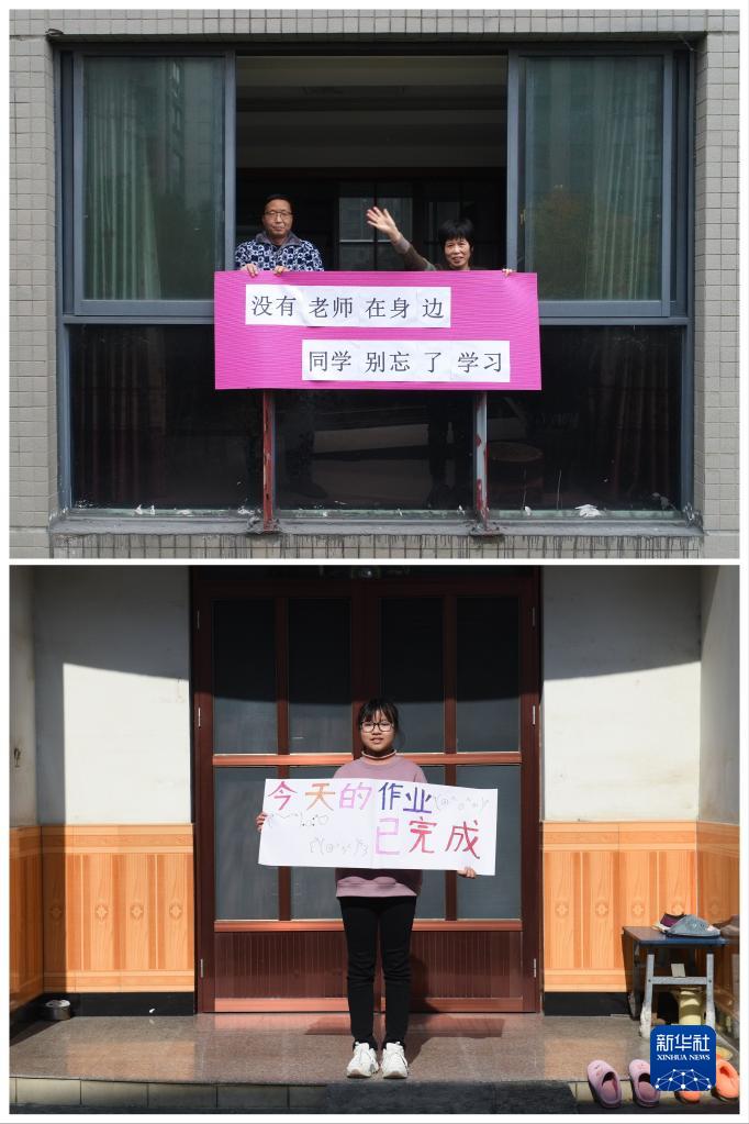 这张拼版照片的上图:12月16日,在百官街道阳光假日小区,同为中学教师的陆先生和妻子谢女士向已经停课的学生们表达问候(无人机照片)。
