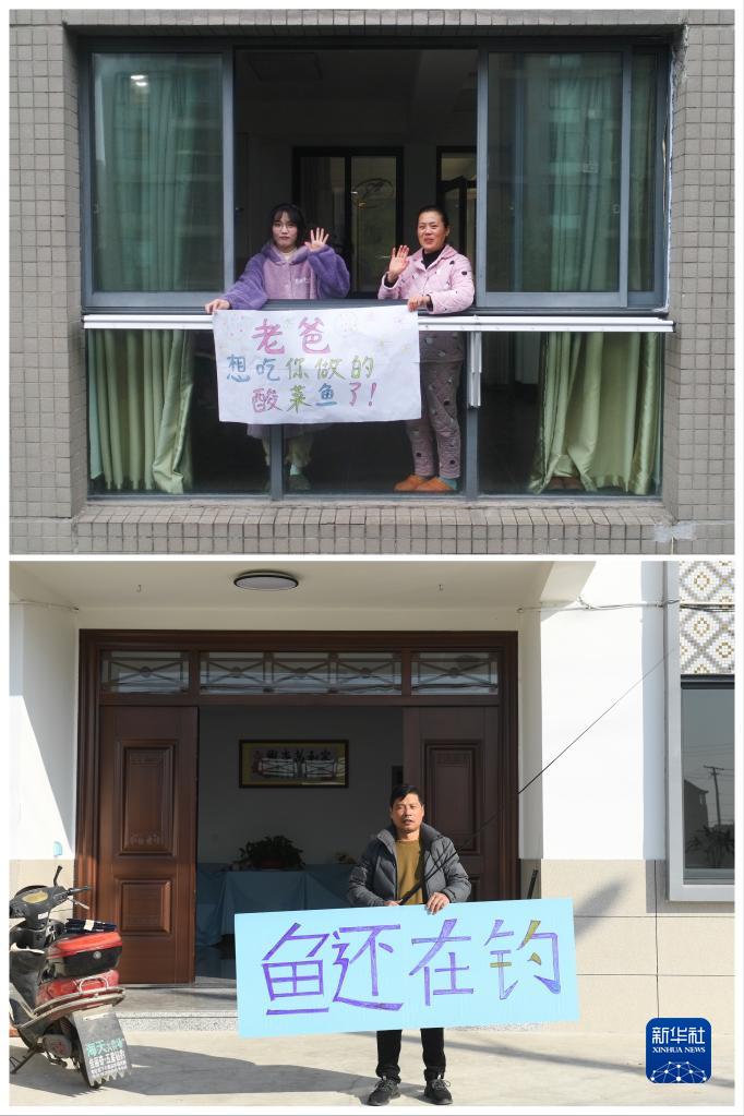 这张拼版照片的上图:12月16日,在百官街道阳光假日小区,退休工人叶先生和妻子陈女士在家中展示他们对家乡的问候(无人机照片)。