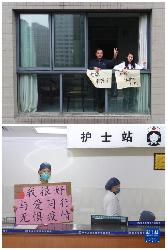 这张拼版照片的上图:12月16日,在百官街道阳光假日小区,中医诊所工作人员石先生和女儿向正在一线抗疫的家人传达问候。
