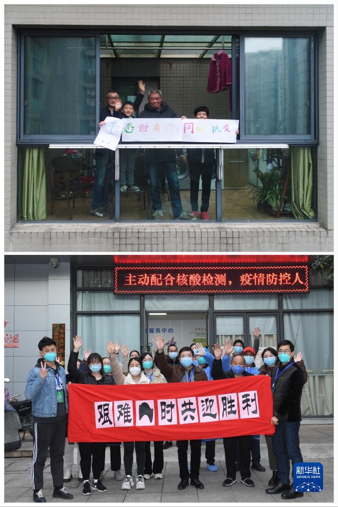 这张拼版照片的上图:12月16日,在百官街道阳光假日小区,工程师廖先生(左一)和家人在家中向抗疫一线工作人员表达感谢(无人机照片)。