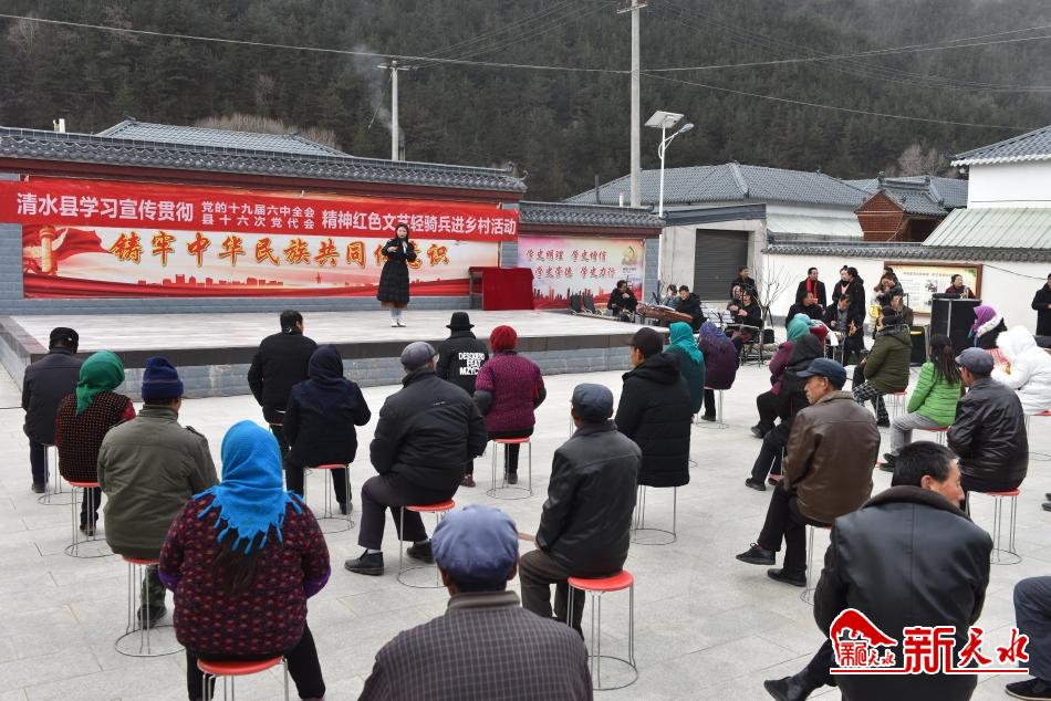 为深入学习宣传贯彻党的十九届六中全会和清水县第十六次党代会精神,进一步丰富广大群众精神文化生活,清水县组织红色文艺轻骑兵赴18乡镇开展巡回宣传演出,通过创编的音乐快板、眉户戏、诗歌朗诵等文艺节目,让党的十九届六中全会和县第十六次党代会精神飞入寻常百姓家。
