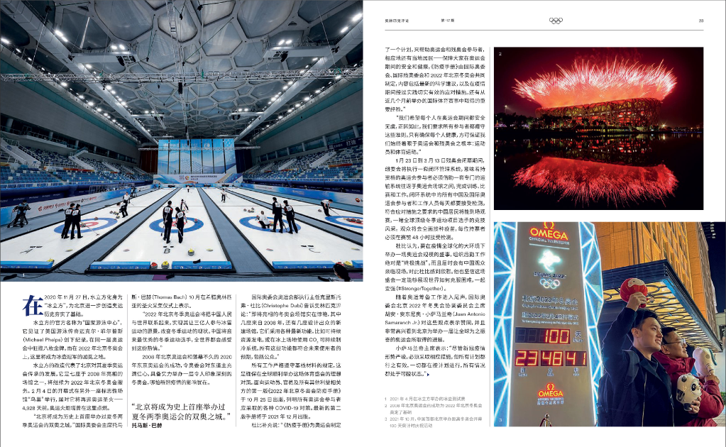 封面故事以“冬奥会新时代”为题,文中开篇引用国际奥委会主席巴赫的讲话:“北京将成为历史上首座举办过夏冬两季奥运会的双奥之城。北京冬季奥运会将把中国人民与世界联系起来,实现其让三亿人参与冰雪运动的愿景,改变冬季运动的现状。中国将迎来最优秀的冬季运动选手,全世界都会感受到这份热情。”