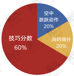 比赛成绩是由回转技巧分数、空中跳跃动作分数以及运动员比赛用时换算成的分数相加所得。各项占得分的百分比为60%、20%、20%。