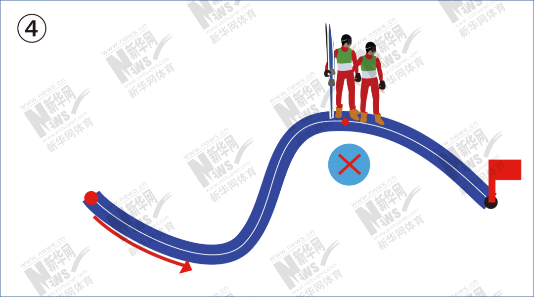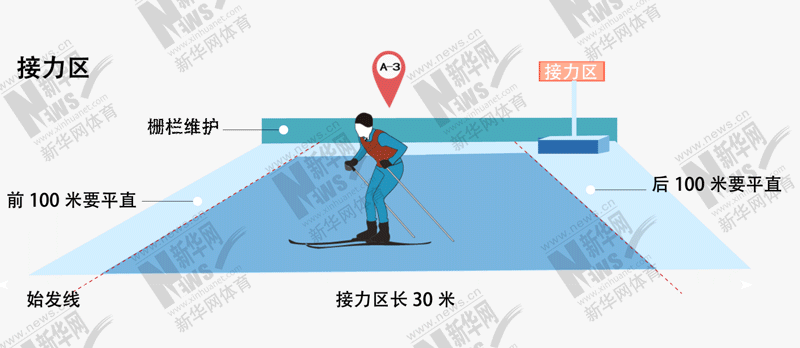 接力区有栅栏围绕并设置明显的标志符号,长度有30米。接力区前后100米以内的雪道要平直且标志明显。在终点线和接力区之间留有一个宽5米的安全区。