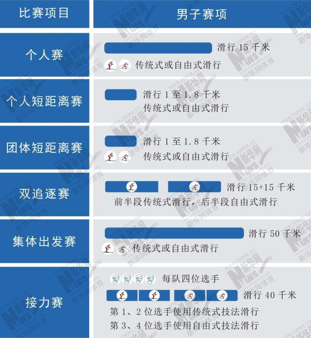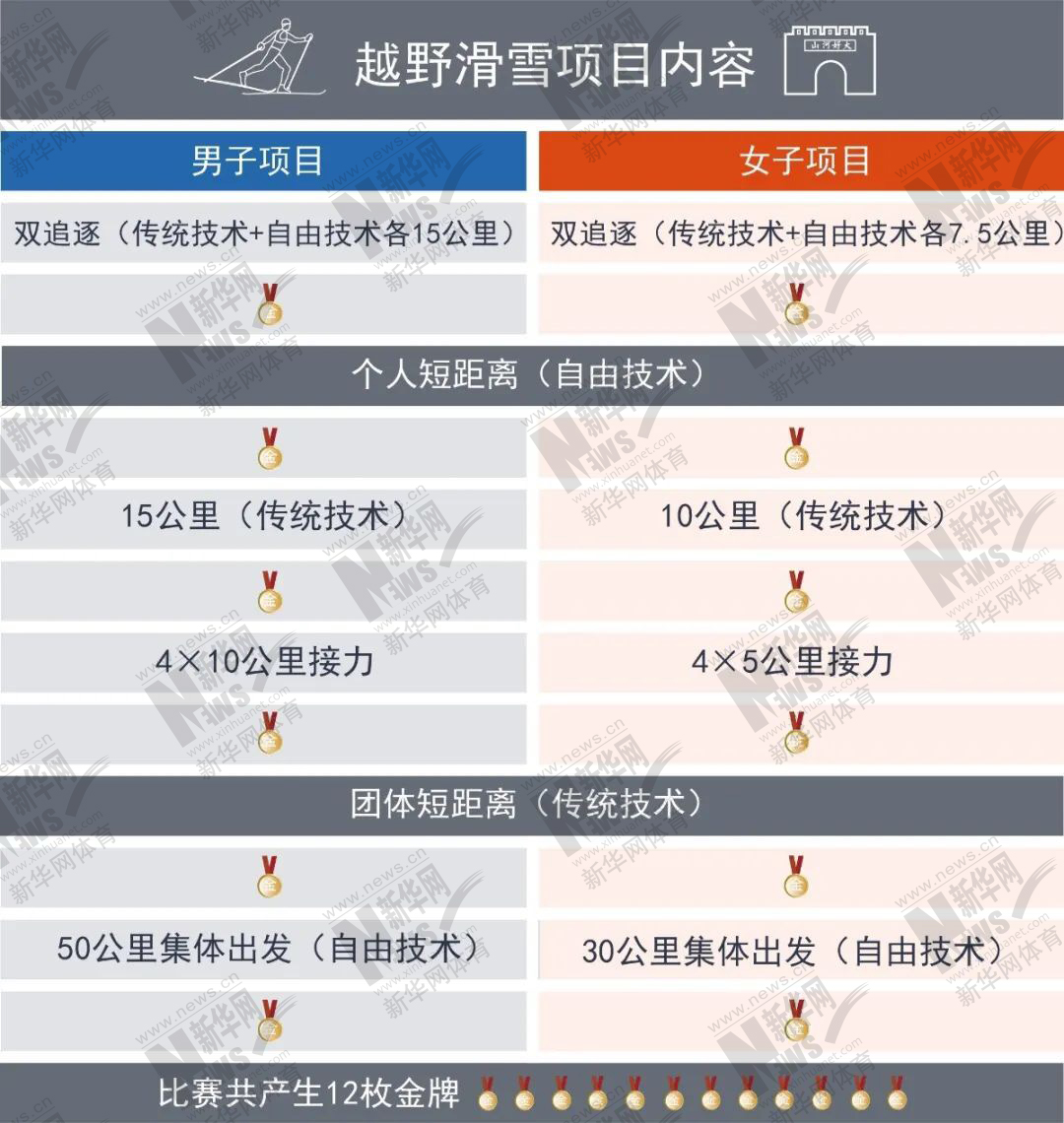 北京2022年冬奥会越野滑雪竞赛项目包括男子双追逐、个人短距离、15公里、4×10公里接力、团体短距离、50公里集体出发;女子双追逐、个人短距离、10公里、4×5公里接力、团体短距离、30公里集体出发。各路“雪上英杰”将在张家口赛区展开12枚金牌的角逐。