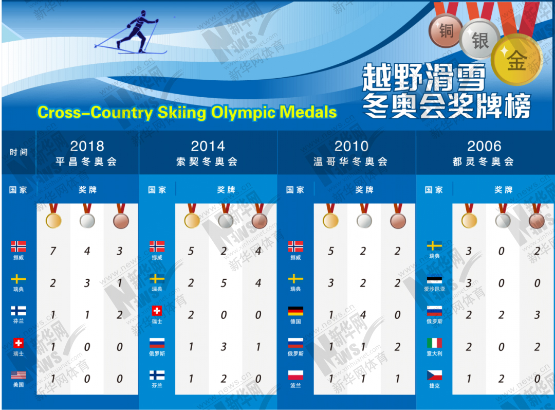 纵观历届冬奥会越野滑雪奖牌榜,可以看出挪威、瑞典、瑞士等北欧国家实力非凡,新华体育在这里为他们打call!