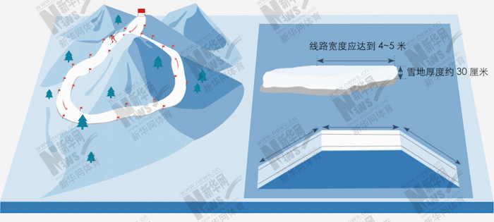 越野滑雪线路宽度通常为4~5米,雪地厚度约30厘米。线路要尽量选择森林、山丘等多变地形,以保证运动员全面完成登山、转弯、滑行、滑降等技术。越野滑雪线路包含上坡、下坡、起伏三种路面,每种路面各占总长度的1/3,为保证运动员生命安全,线路不宜有急转弯和落差大的陡坡。