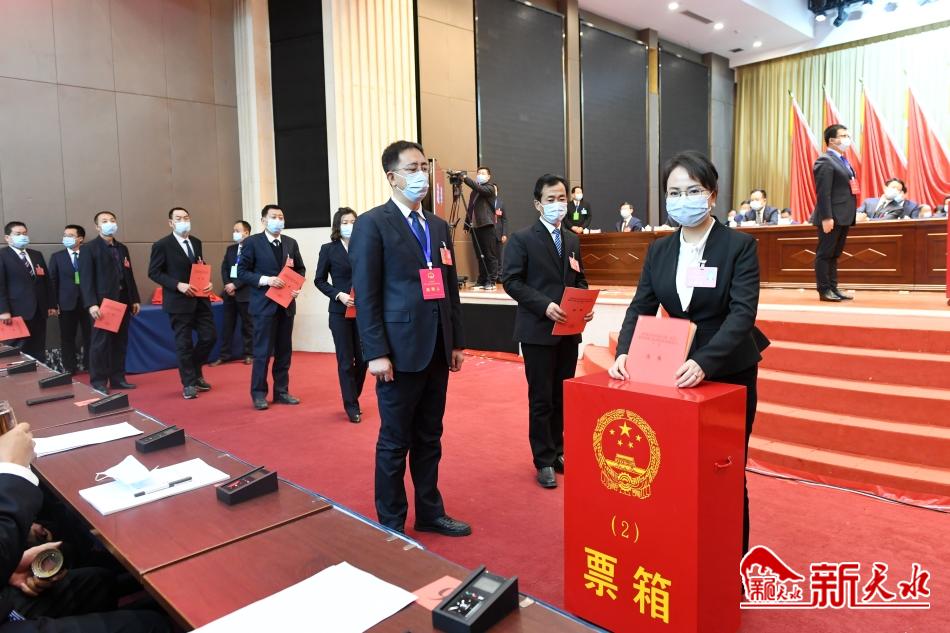 会议以无记名投票的方式,选举了天水市第八届人民代表大会常务委员会主任、副主任、秘书长、委员,选举了市人民政府市长、副市长,选举了天水市监察委员会主任,选举了市中级人民法院院长、市人民检察院检察长。经大会主席团第五次会议确认,张建杰当选为天水市第八届人民代表大会常务委员会主任;索鸿宾、张栋梁、申君明、李焕珍、何晓斌、何吉洲当选为天水市第八届人民代表大会常务委员会副主任;杨坤当选为天水市第八届人民代表大会常务委员会秘书长;丁志杰、于剑锋、马兆让、马泽鹏、方西马、石峰、田丰、刘兵、刘斐龙、牟建林、杜作明、李勇哲、李海巴、李强、李耀辉、杨永宏、杨晓妮、肖江、陈世平、陈维林、周俊才、赵继文、侯少军、秦福才、晏平、郭建生、章圣架、董强、释一钦、靳志强、蔡全增、鲜志伟、魏胜奎当选为天水市第八届人民代表大会常务委员会委员。王国先当选为天水市人民政府市长;贾义翔、董小平、汪小娟、郭庆祥、刘国军、胡志勇当选为天水市人民政府副市长;郝觉民当选天水市监察委员会主任;张志利当选为天水市中级人民法院院长;杨耀明当选为天水市人民检察院检察长(须提请甘肃省人民代表大会常务委员会批准)。