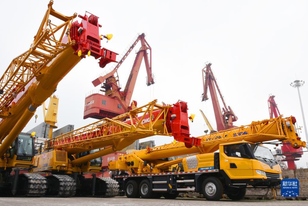 一批工程机械设备在江苏连云港港口码头集结等待装船出口(5月31日摄)。新华社发(耿玉和 摄)
