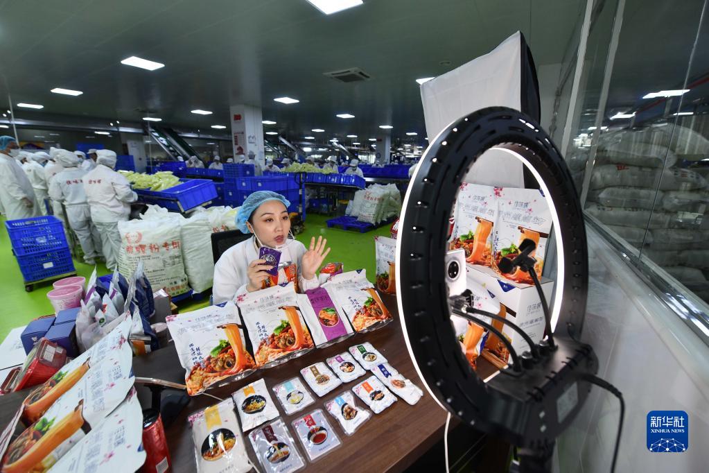 在广西一家螺蛳粉生产企业车间,工作人员在直播销售螺蛳粉(6月17日摄)。新华社记者 黄孝邦 摄