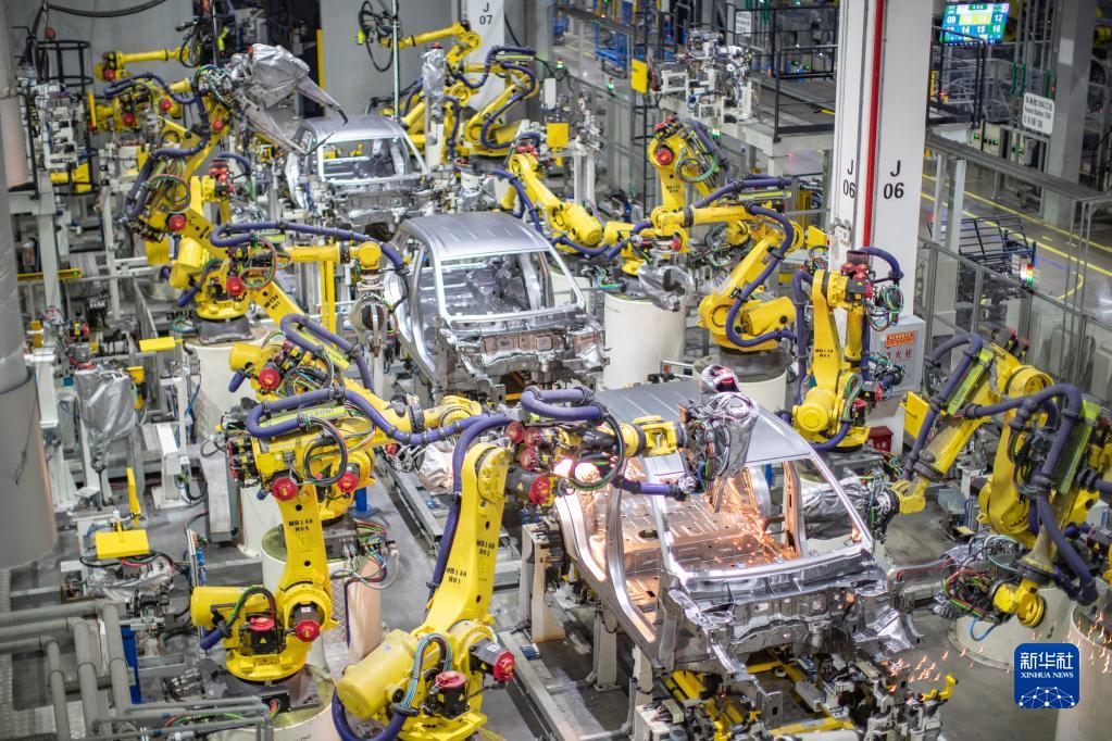 重庆一家新能源汽车企业使用智能化焊接机器人进行焊接作业(4月2日摄)。新华社记者 黄伟 摄